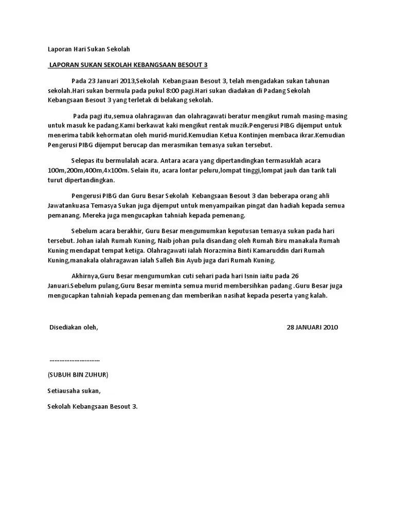 Acara lari 4 x 100 meter menjadi acara kemuncak sukan pada hari itu. Laporan hari sukan sekolah menengah agama sains kuala pilah tarikh: Pada 23 januari 2013,sekolah kebangsaan besout 3, telah mengadakan sukan tahunan. Laporan hari sukan sekolah kebangsaan ulu ranan 2014 sekolah kebangsaan ulu ranan d/a pejabat pendidikan daerah kanowit 96700 kanowit laporan hari sukan . Laporan hari sukan negara peringkat sekolah 2016 tarikh : Anda dikehendaki menyediakan laporan tentang temasya sukan tahunan yang dijalankan. Contoh laporan berformat format karangan jenis laporan karangan jenis ini menghendaki anda melaporkan sesuatu peristiwa yang didengar. 7.30 pagi 1.00 petang lokasi: